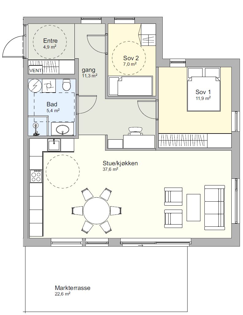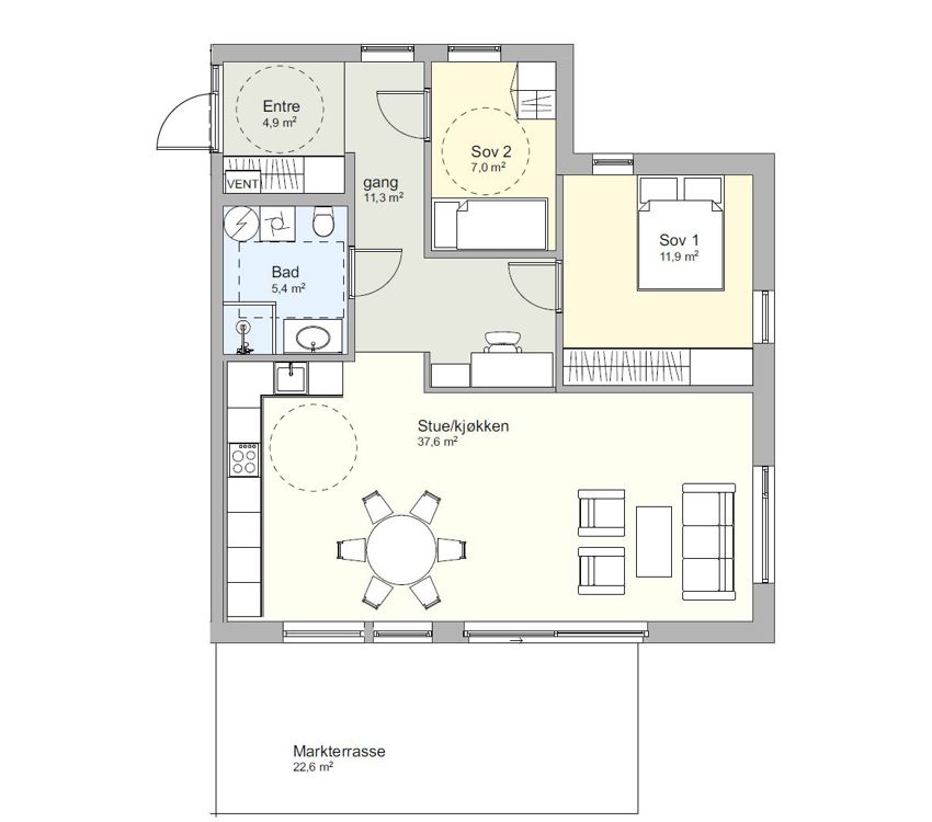 Leiligheten ligger i 1. boligetasje i det gule bygget, og vil få en stor markterrasse mot syd med utgang fra stuen. Leiligheten har en romslig stue/kjøkkenløsning, 2 soverom og bad - i tillegg kan den ekstra plassen i gangen gjerne benyttes til hjemmekontor. Vindu mot øst gir stuen ekstra lys - og utsikt mot bebyggelsen i øvre bydel.