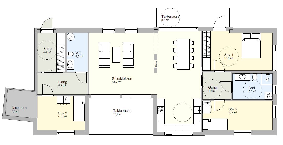 Toppleiligheten i det gule bygget kan by på takterrasser mot sør og nord - her kan man både sola hele dagen og solnedgangen. Leiligheten har en åpen stue/kjøkkenløsning på hele 53,7 kvm - og en biopeis vil være en flott romdeler mot spisestuen. 2 av soverommene ligger i en egen fløy med tilknytning til bad - mens det tredje soverommet ligger i motsatt ende av leiligheten. Med inngang fra det ene soverommet har leiligheten et disp.areal på 5 kvm. Leiligheten vil få utsikt mot havet og fjellene - og noe over nabobebyggelsen.