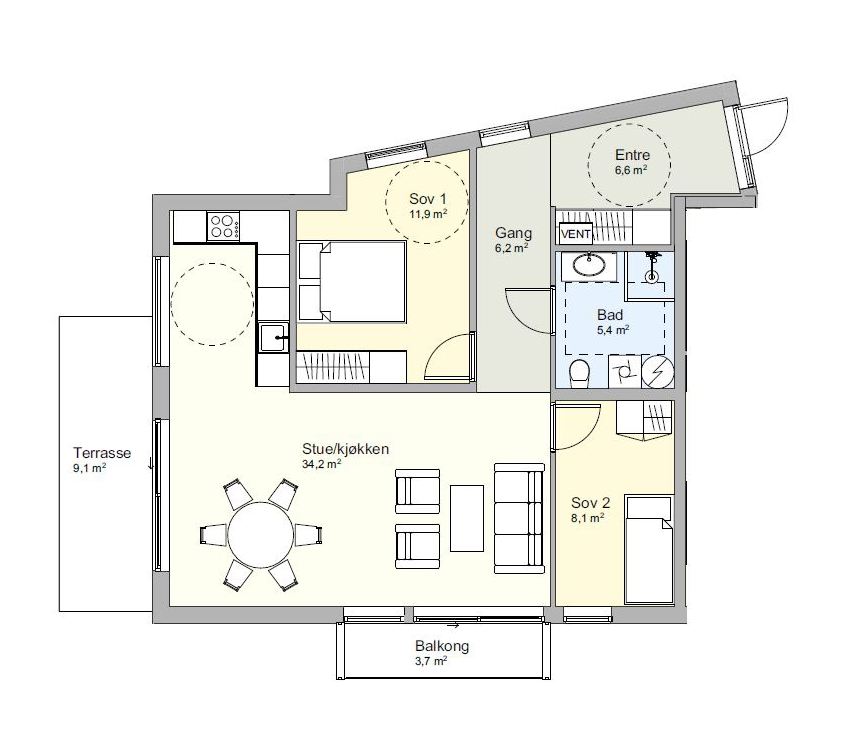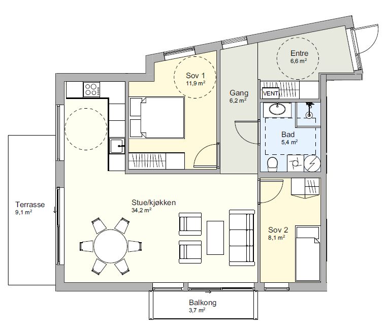 Leiligheten ligger i 2. boligetasje på det rød bygget, og vil - som den eneste leiligheten i prosjektet, få balkong både mot sør og vest - begge med utgang fra stuen. Vindu på kjøkkenet mot vest - noe som i en åpen stue/kjøkkenløsning med heveskyvedør til to balkonger vil gjøre rommet lyst og trivelig.