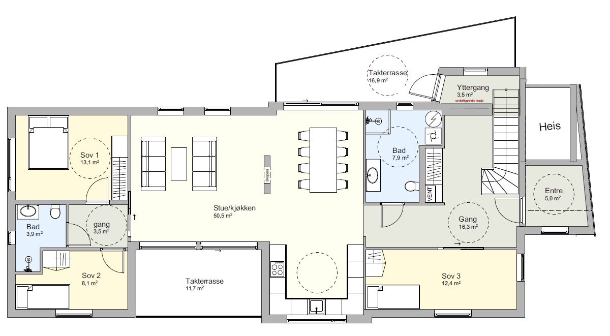 Toppleiligheten i det rød bygget, er en romslig leilighet - med en stue/kjøkkenløsning på hele 50 kvm, hvor en biopeis vil være en flott romdeler mot spisestuen. Utgang til romslige takterrasser både mot sør og nord fra stue/spisestue. To av soverommene ligger i egen fløy, tilknyttet eget bad - mens det tredje soverommet ligger i motsatt ende av leiligheten - ved bad/vaskerom. Leiligheten vil få utsikt mot både sør og nord - og vil se både hav og fjell - samt skue over bebyggelsen foran.